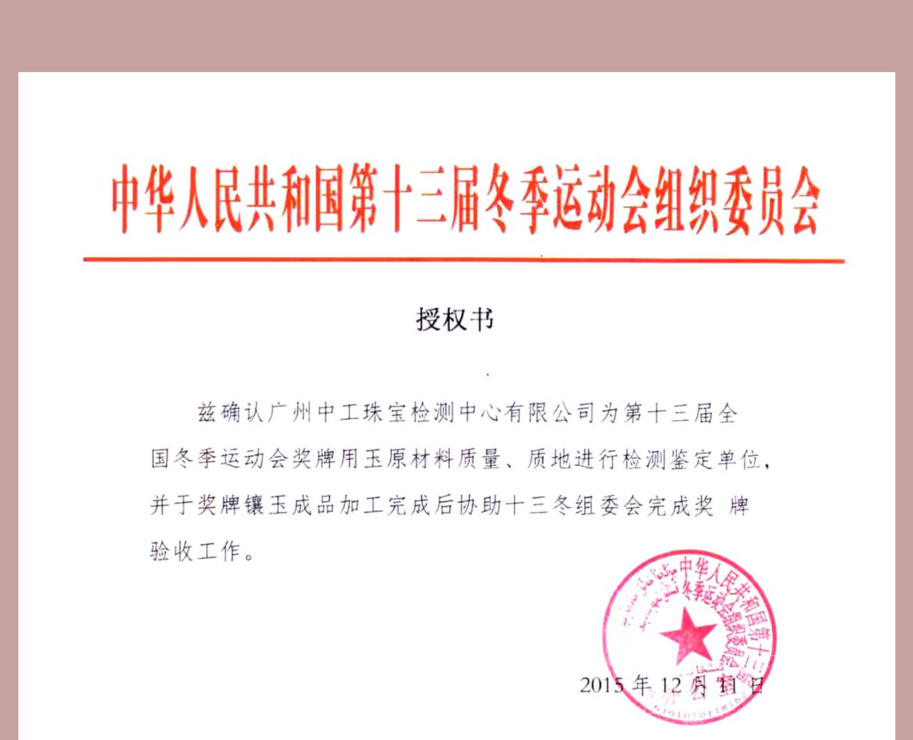 广州龙珠直播受中华人民共和国第十三届冬季运动会组委会的授权委托对运动会奖牌用玉原料质量、质地、颜色进行检测鉴定...